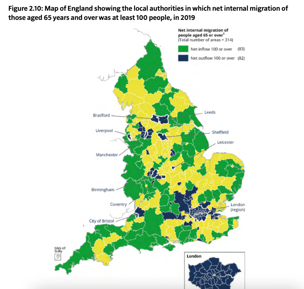 Whitty also highlights the geographical distribution of older people in England, with greater concentrations in less populated areas: ‘A large proportion of people migrate away from cities before they reach older age. The result is that metropolitan areas largely maintain their current demographic, ageing only slowly, while some areas, particularly rural, semi-rural and coastal areas in the periphery, age much faster’. Older people living in those areas are more likely to struggle with access to health care, transport and other services, and more likely to face a digital divide, highlighting the need to improve the infrastructure of support and address geographical inequalities.
